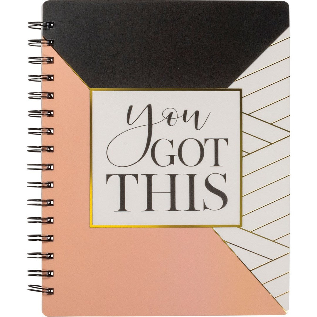 A spiral notebook measuring 7" x 9" x 0.50", lending a "You Got This" sentiment with double-sided geometric designs and gold foil accents. Contains 120 lined pages.